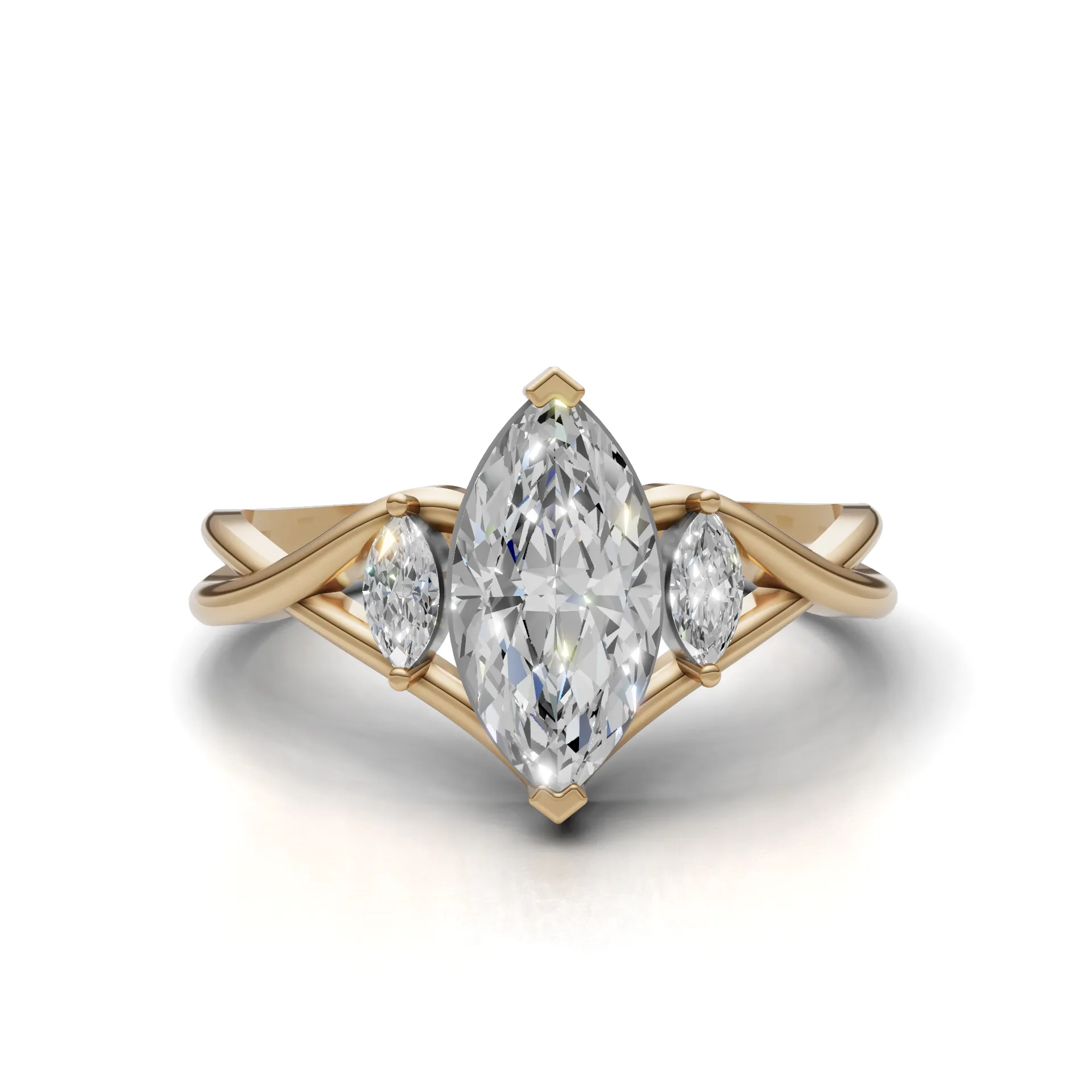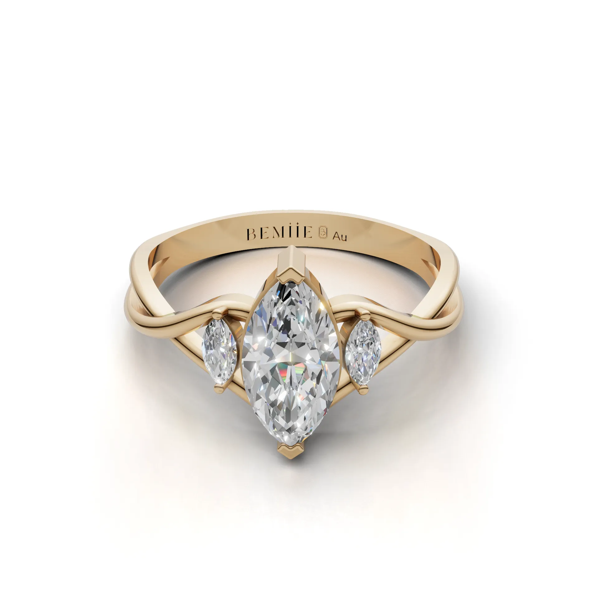 Nhẫn cầu hôn Eternal Glow là lời ca ngợi tuyệt đẹp dành cho vẻ đẹp kiêu hãnh và sức sống mãnh liệt của hoa hướng dương, một loài hoa luôn hướng khát vọng về phía ánh sáng chói chang. Lấy cảm hứng từ cánh hoa vàng mềm mại, viên đá chủ Marquise cut đã khắc họa nguyên vẹn vẻ đẹp dịu dàng ấy, tỏa sáng ở trung tâm giữa hai viên đá phụ lấp lánh.