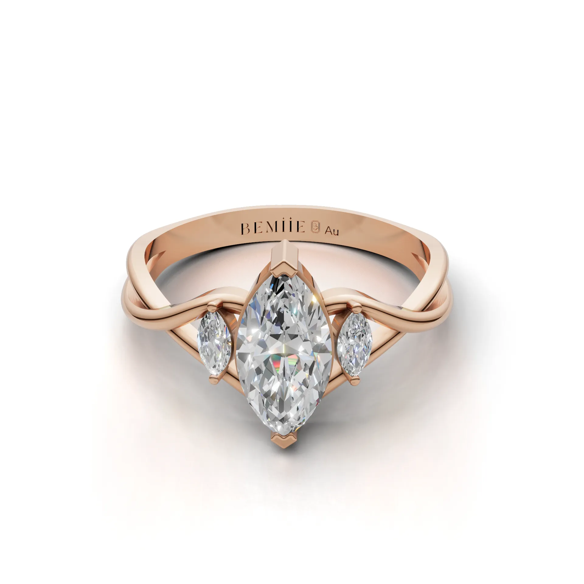 Đường nét uốn lượn mềm mại của thân nhẫn gợi hình cánh hoa vươn lên đón nắng, đồng thời ẩn chứa biểu tượng trái tim và dấu vô cực – tượng trưng cho tình yêu vĩnh cửu và sự tái sinh không hồi kết.