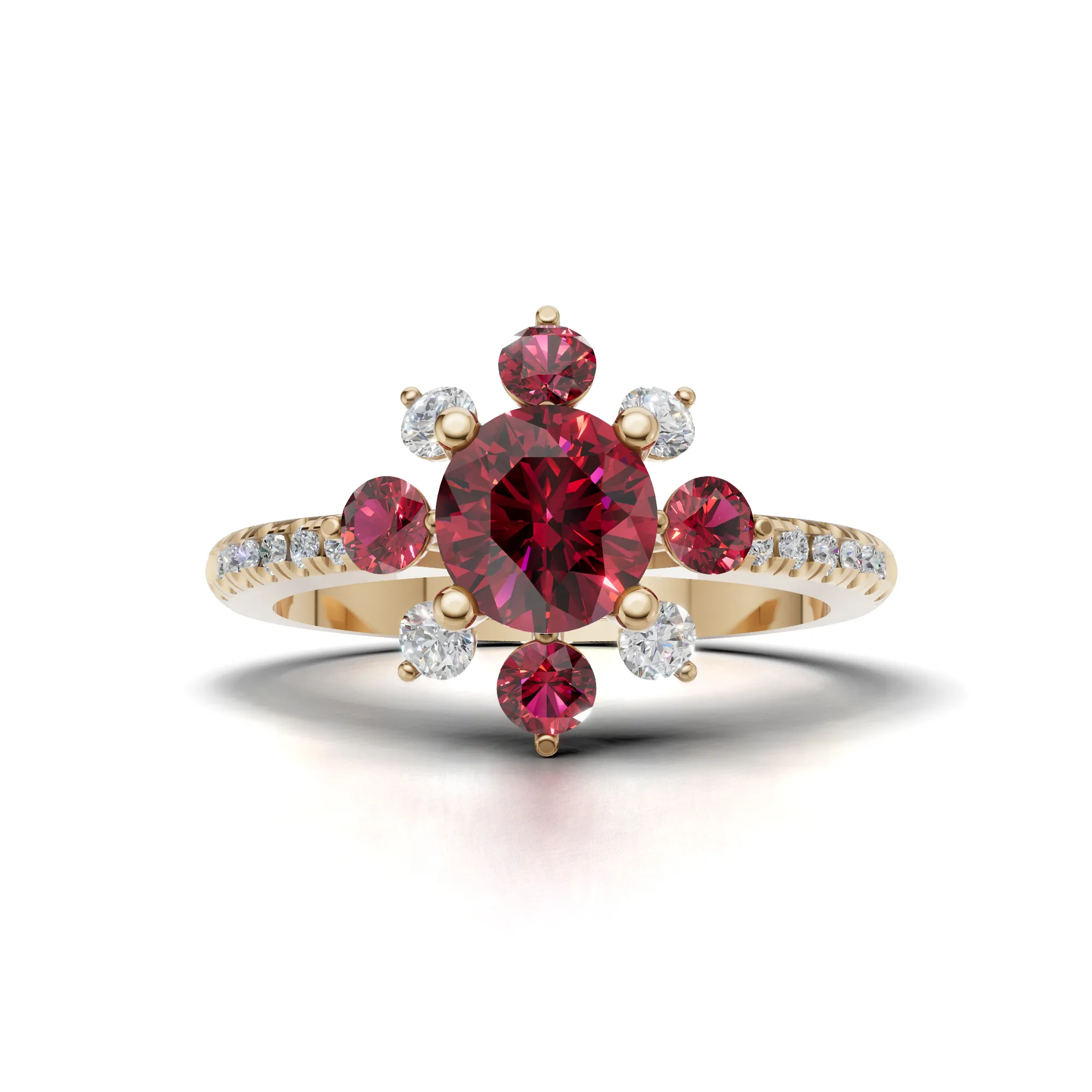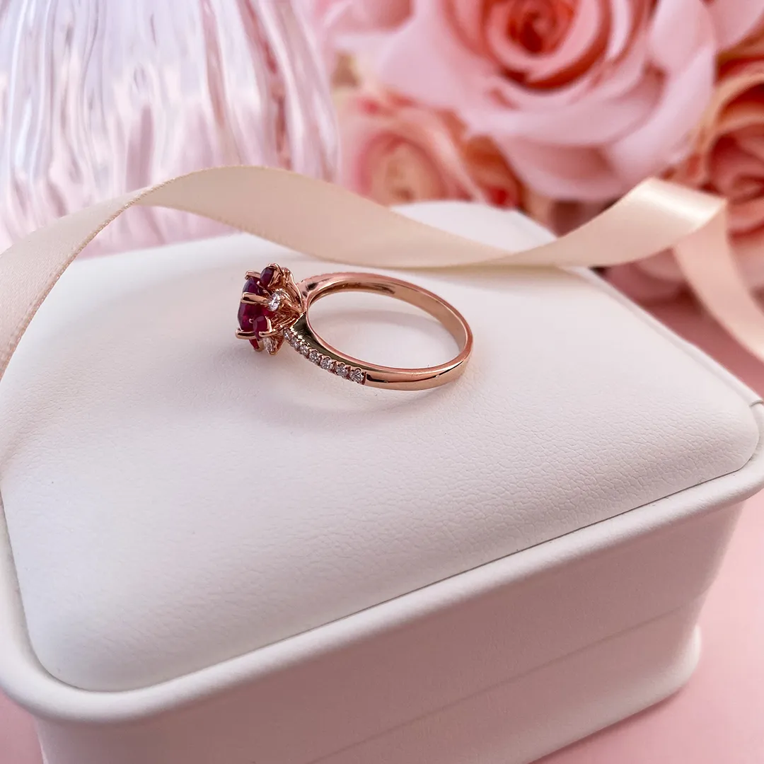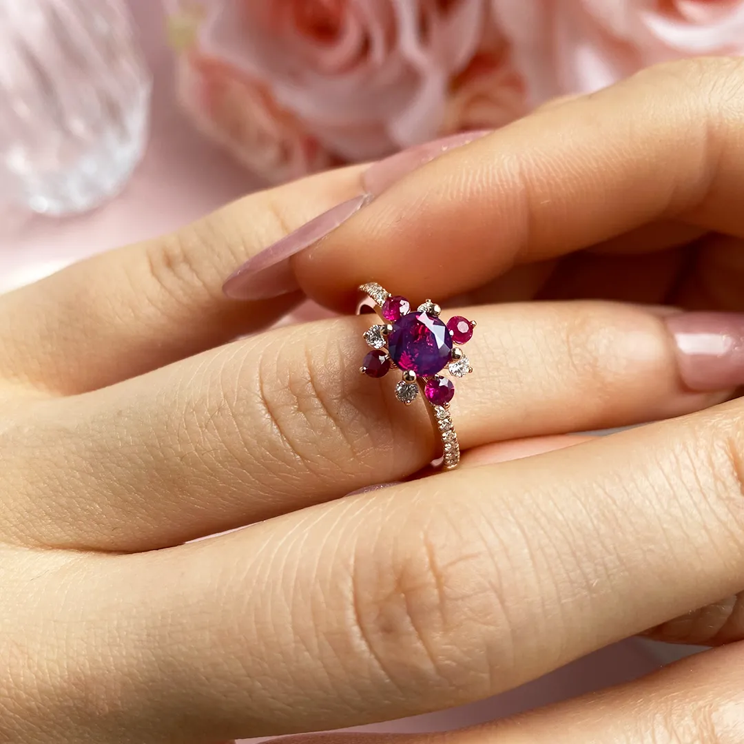 Trung tâm chiếc nhẫn là viên đá Ruby tròn rực đỏ, được ôm trọn bởi 4 chấu vững chãi, tượng trưng cho tình yêu bền chặt và lời hứa không đổi. Bao quanh viên chủ là 8 viên đá phụ được sắp xếp xen kẽ giữa Ruby đỏ và kim cương trắng tự nhiên, tái hiện hình ảnh một bông cúc nhỏ đang nở rộ, ngọt ngào và tinh khôi. Đai nhẫn thanh mảnh đính kim cương tấm li ti chạy dọc hai bên, làm nổi bật sắc đỏ nồng nàn của Ruby, tạo nên tổng thể hài hòa và đầy tinh tế.