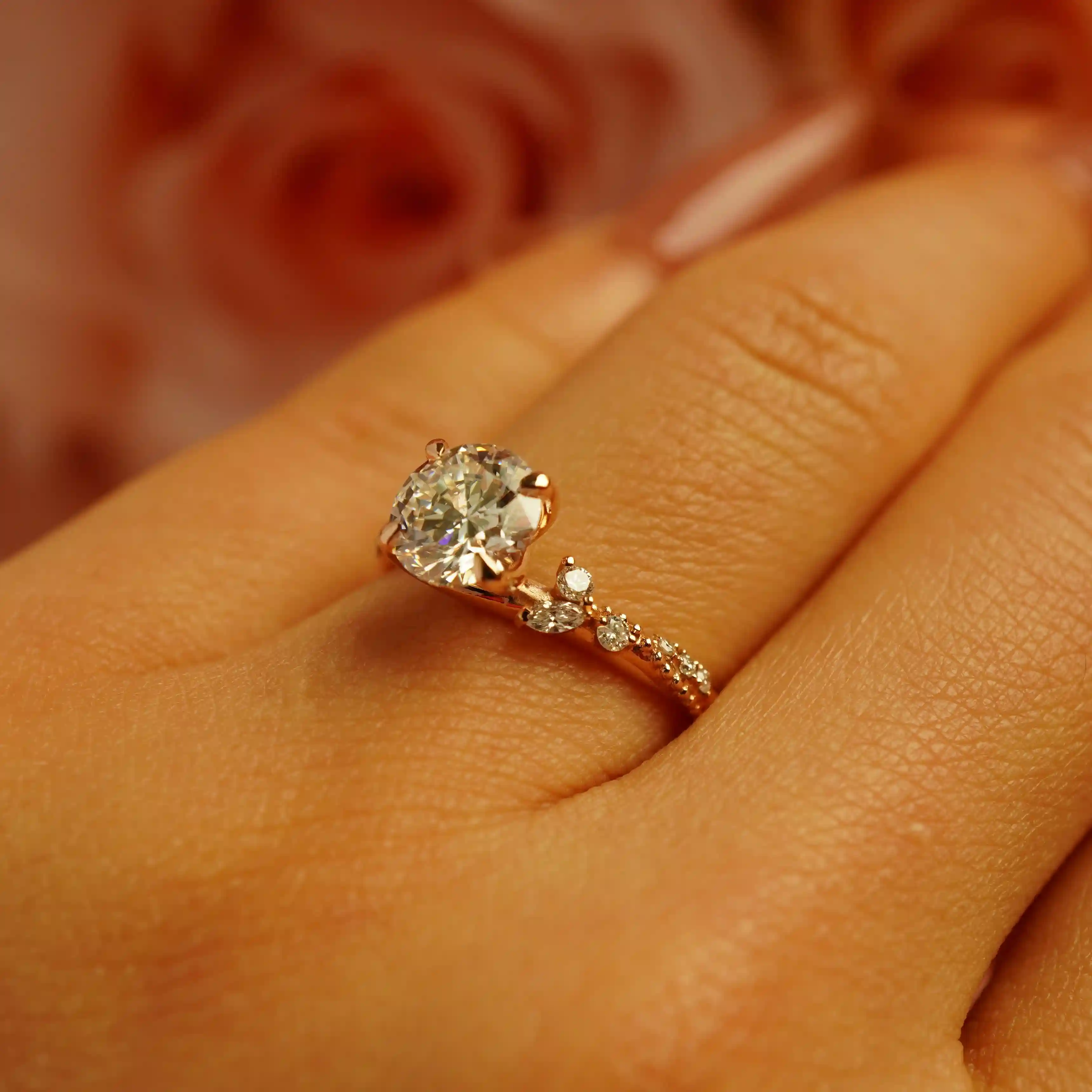 Đi liền với đó là những hạt vàng uốn lượn tinh tế, tái hiện hình ảnh dây leo mềm mại, ôm lấy viên đá chủ trung tâm. Tất cả các chi tiết hòa quyện lại, tạo nên một thiết kế thanh thoát, tự nhiên và vô cùng độc đáo, khác biệt hẳn so với những mẫu nhẫn cầu hôn truyền thống.