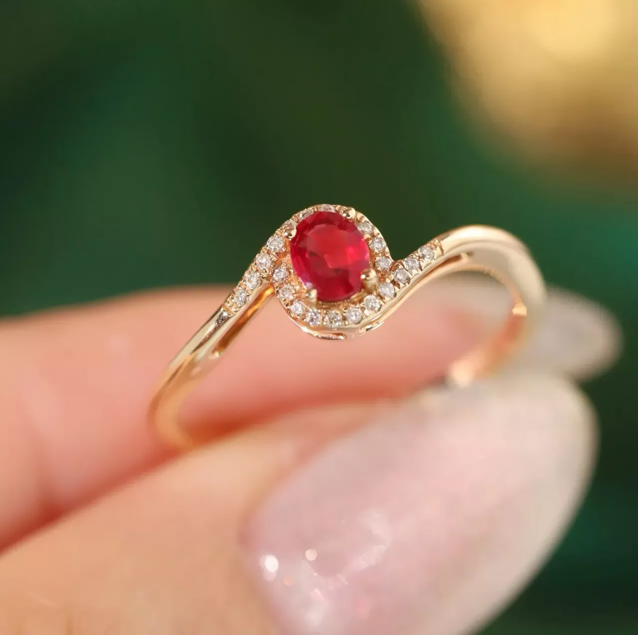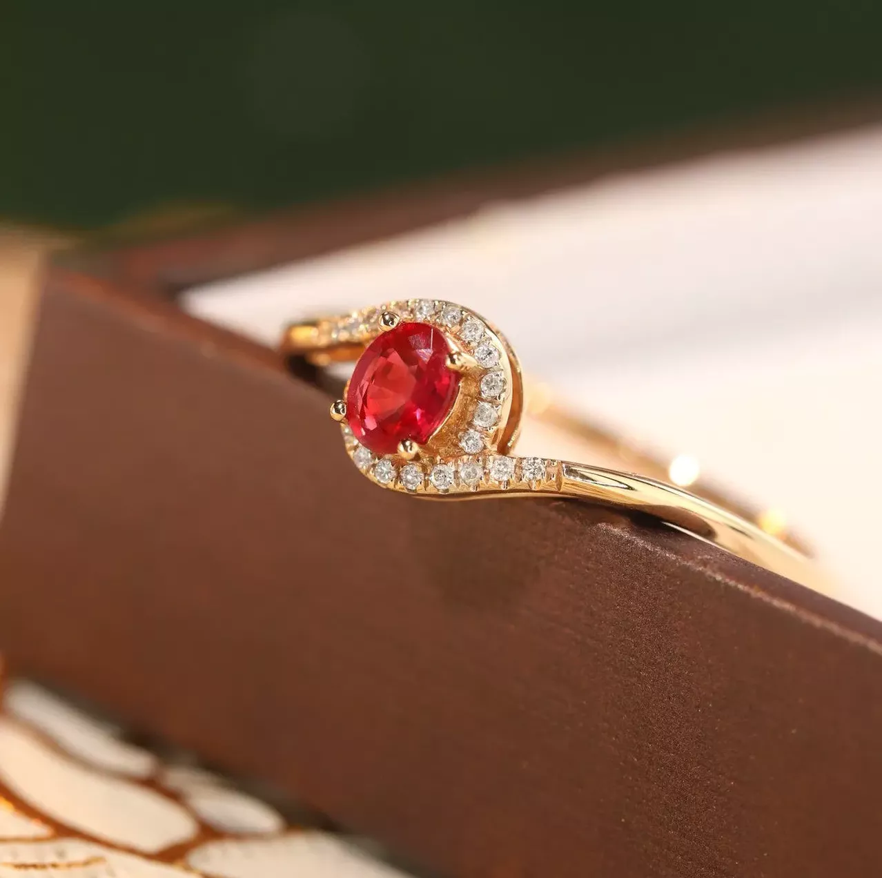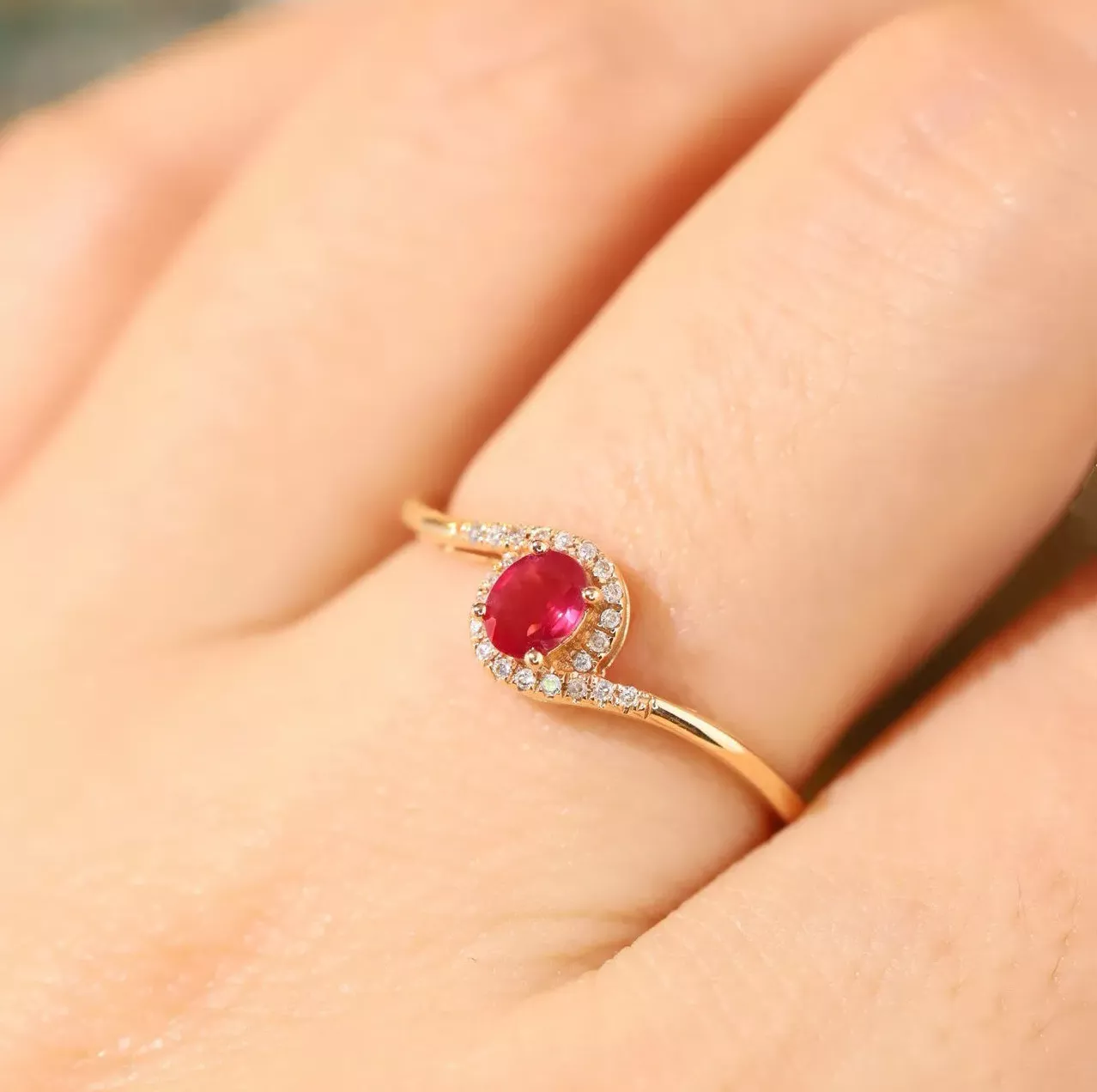 Nhẫn cầu hôn Rosé Rouge được thiết kế theo kiểu halo hiện đại, nơi viên Ruby đỏ oval ở trung tâm tỏa sáng như trái tim đang đập rộn ràng trong lồng ngực. Bao quanh viên đá chủ là vòng halo đính đá tấm kim cương trắng sáng, khéo léo tạo nên sự tương phản tuyệt đẹp giữa sắc đỏ nồng nàn và ánh sáng tinh khiết, giúp viên Ruby trở nên nổi bật và sống động hơn bao giờ hết.