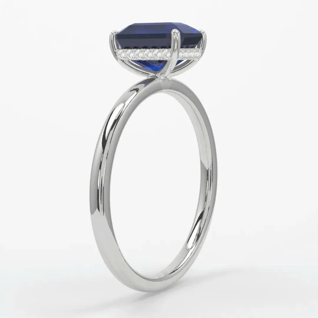Ở trung tâm, viên Sapphire màu xanh hoàng gia được cắt kiểu Radiant Cut , hội tụ giữa độ lấp lánh của brilliant và sự mạnh mẽ của step-cut. Tông màu xanh thẳm sâu như đáy đại dương tượng trưng cho sự vĩnh hằng, khiến viên đá trở thành điểm nhấn mạnh mẽ nhưng vẫn giữ nét dịu dàng đầy nữ tính. Phía dưới, vòng kim cương tấm tinh xảo ôm quanh chân đá, tạo nên hiệu ứng ánh sáng lấp lánh khi nhìn từ mọi góc độ, một vẻ đẹp “ẩn” nhưng khiến người khác chẳng thể rời mắt.
