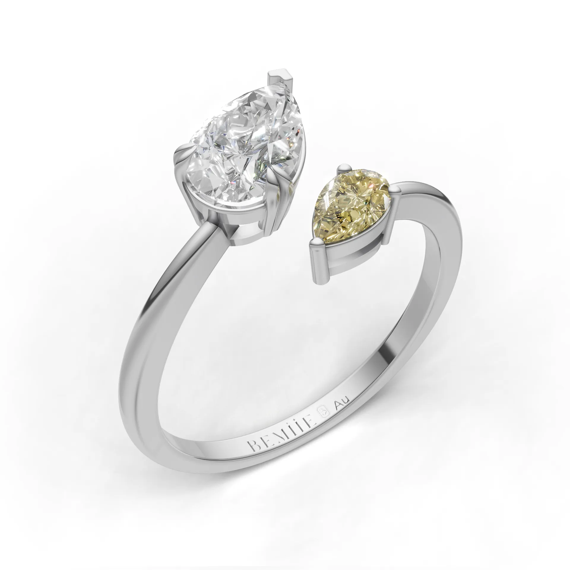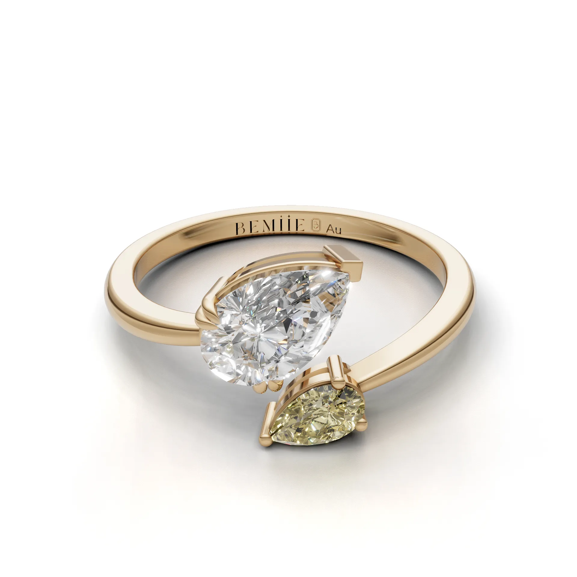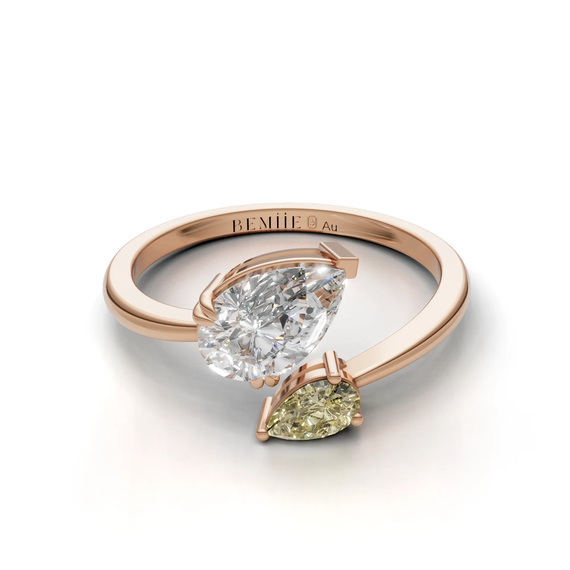 Với giác cắt Pear dịu dàng, quyến rũ, biểu tượng cho hạt hướng dương, kết hợp với phong cách Toi Et Moi đến từ Pháp để tạo nên chiếc nhẫn cầu hôn Silent Seed mềm mại, nữ tính và thanh lịch. Từng chiếc chấu được Bemiie chỉn chu thiết kế, kết hợp giữa chấu nhọn kép, chấu tròn và chiếc chấu chữ V giúp bảo vệ viên đá quý một cách tối đa và khắc họa phong cách trẻ trung, hiện đại.