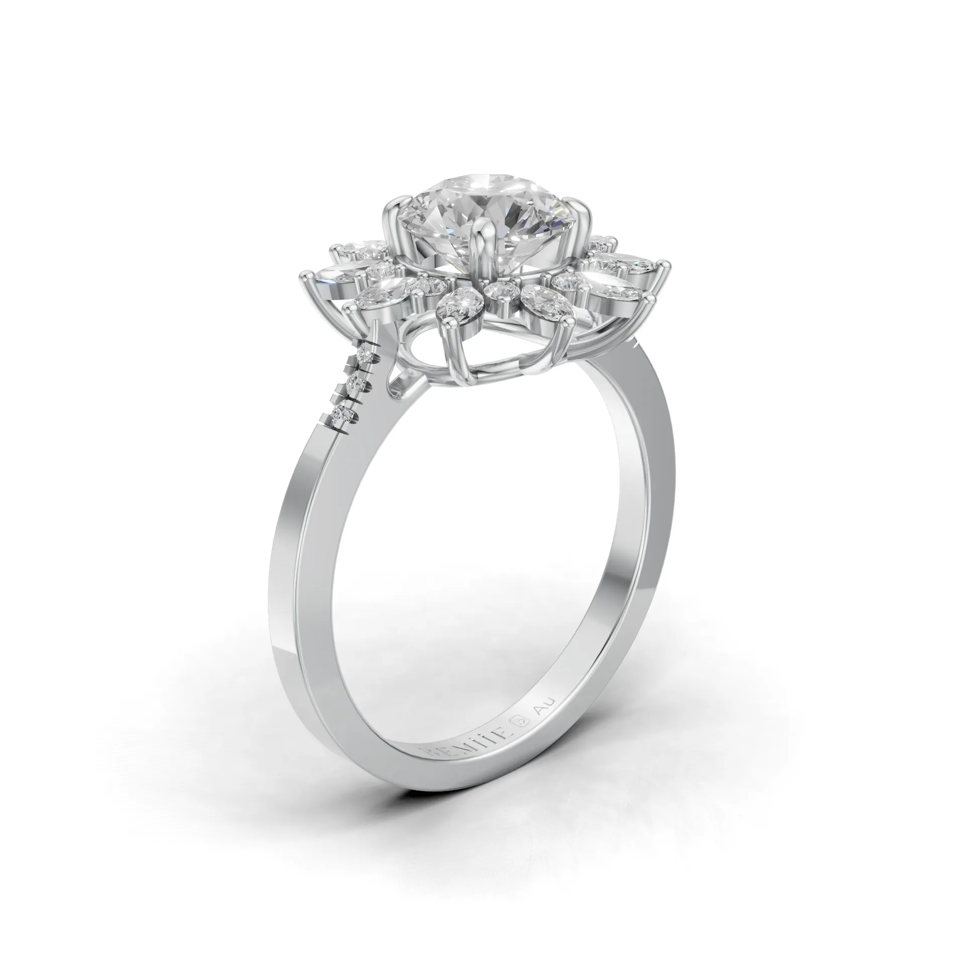 Mỗi cánh hoa được Bemiie khéo léo thiết kế từ sự kết hợp tinh tế của hai giác cắt: Marquise cut (hạt thóc) với hình dáng thuôn dài và Round cut (tròn) cổ điển để tượng trưng cho hai tâm hồn riêng biệt, nhưng cùng nhau hòa hợp, tôn vinh vẻ đẹp của nhau. Viên kim cương tròn ở trung tâm là biểu tượng cho trái tim thuần khiết, là nguồn sáng nuôi dưỡng và lan tỏa tình yêu.