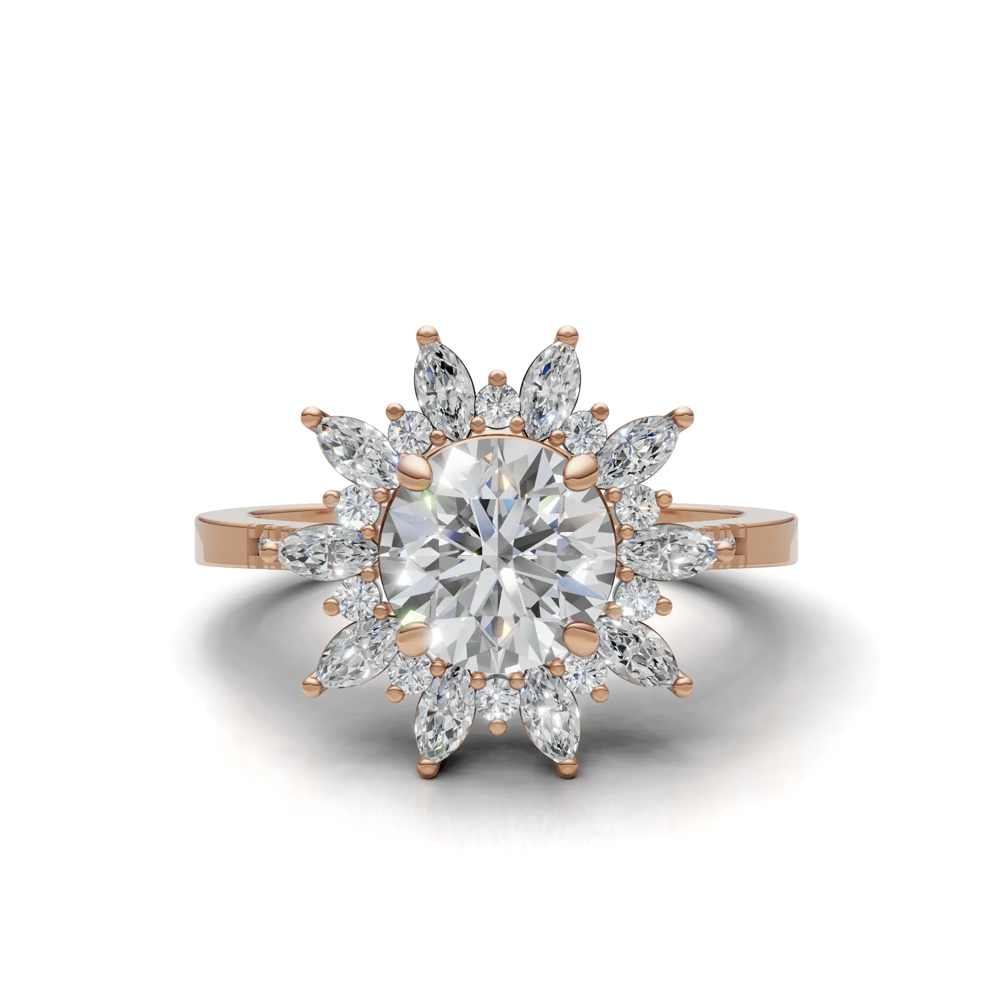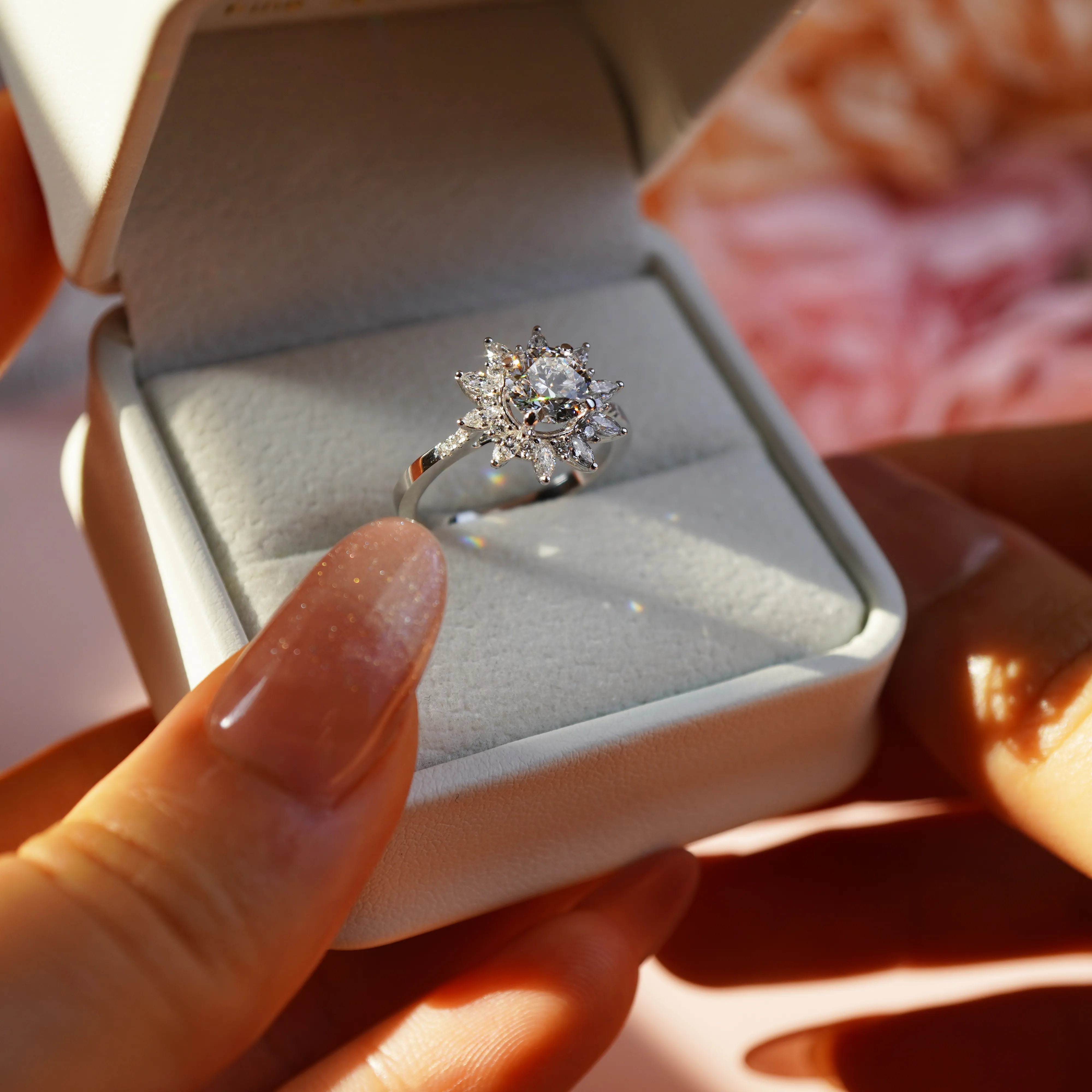 Lấy cảm hứng từ hình ảnh hoa hướng dương đón nắng, nhẫn cầu hôn Sunlit Bloom khắc họa giai đoạn viên mãn nhất của một tình yêu, đó là khi cảm xúc và sự gắn bó đạt đến độ chín muồi, rực rỡ như hoa đang bung nở dưới ánh mặt trời.