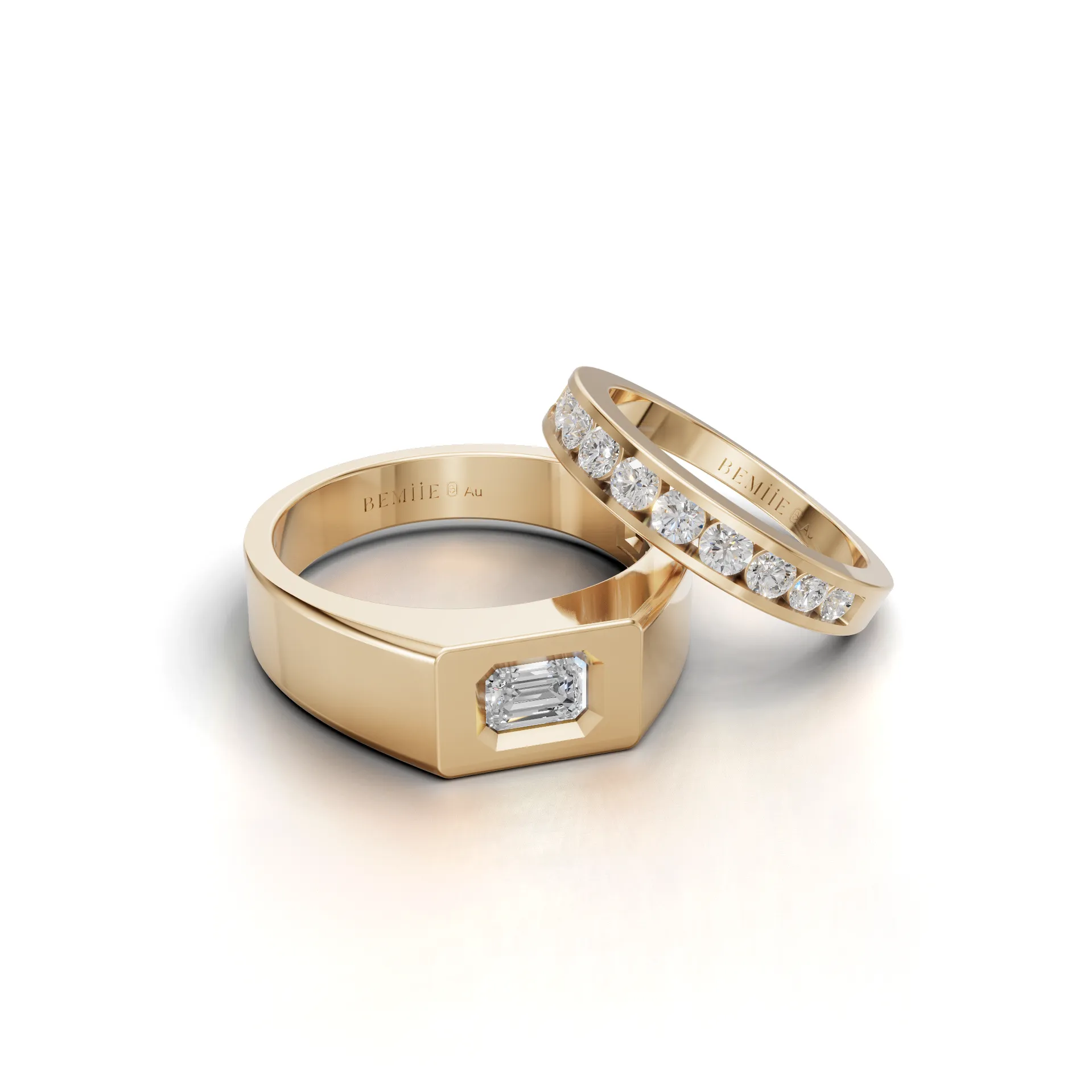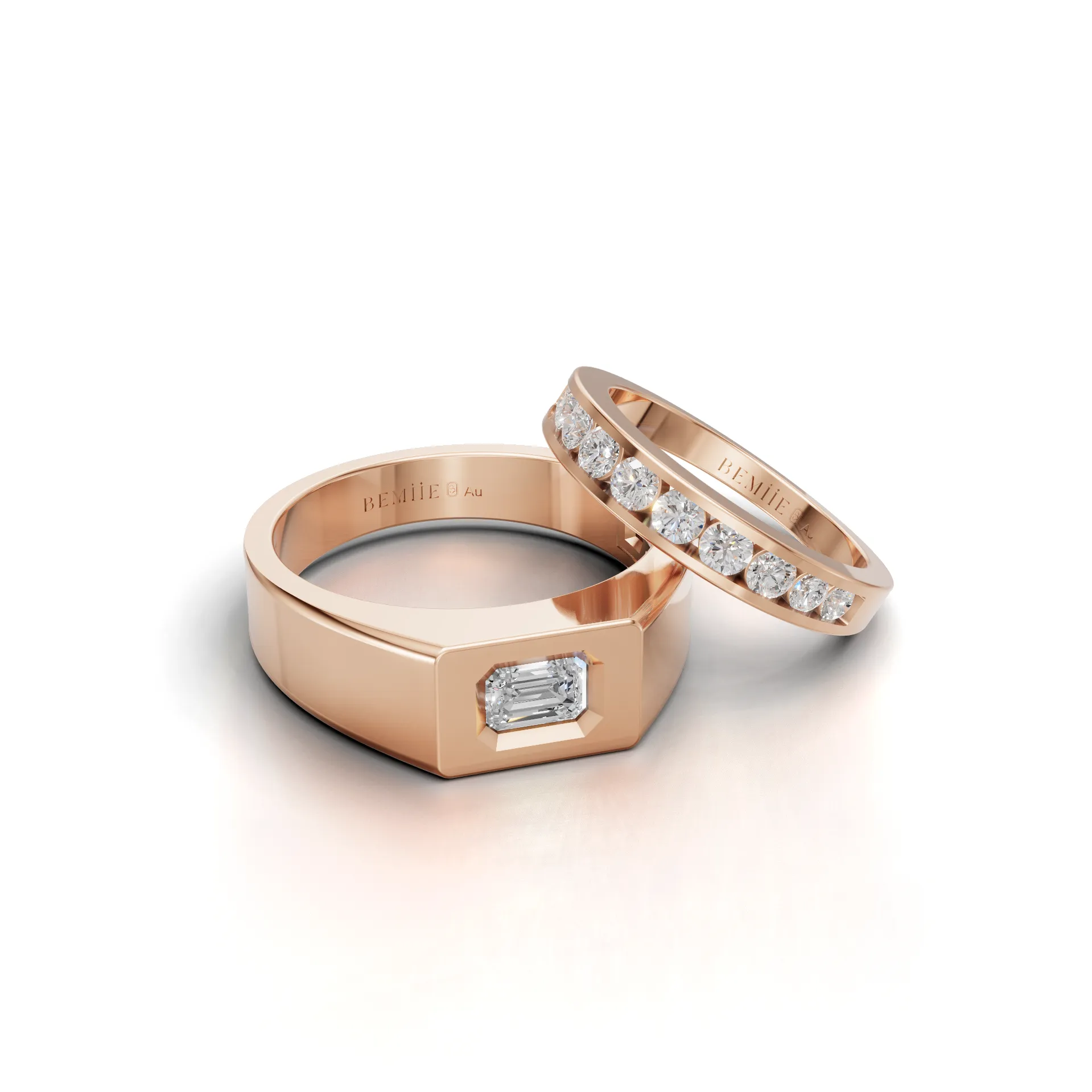 Quan sát hình dáng tổng thể, nhẫn nam sở hữu bản đai vuông dày dặn, mang đến cảm giác chắc chắn, mạnh mẽ và vô cùng nam tính. Mặt nhẫn được thiết kế phẳng, hiện đại, tạo thành điểm nhấn thẩm mỹ rõ ràng. Ở vị trí trung tâm, một viên kim cương tự nhiên emerald cut được đặt tinh tế bên trong khung viền sắc nét. Kiểu cắt emerald với những đường thẳng song song đặc trưng không chỉ tôn lên vẻ đẹp trong trẻo mà còn thể hiện sự chín chắn, bản lĩnh và bền vững, như lời cam kết của người đàn ông trong hành trình hôn nhân.