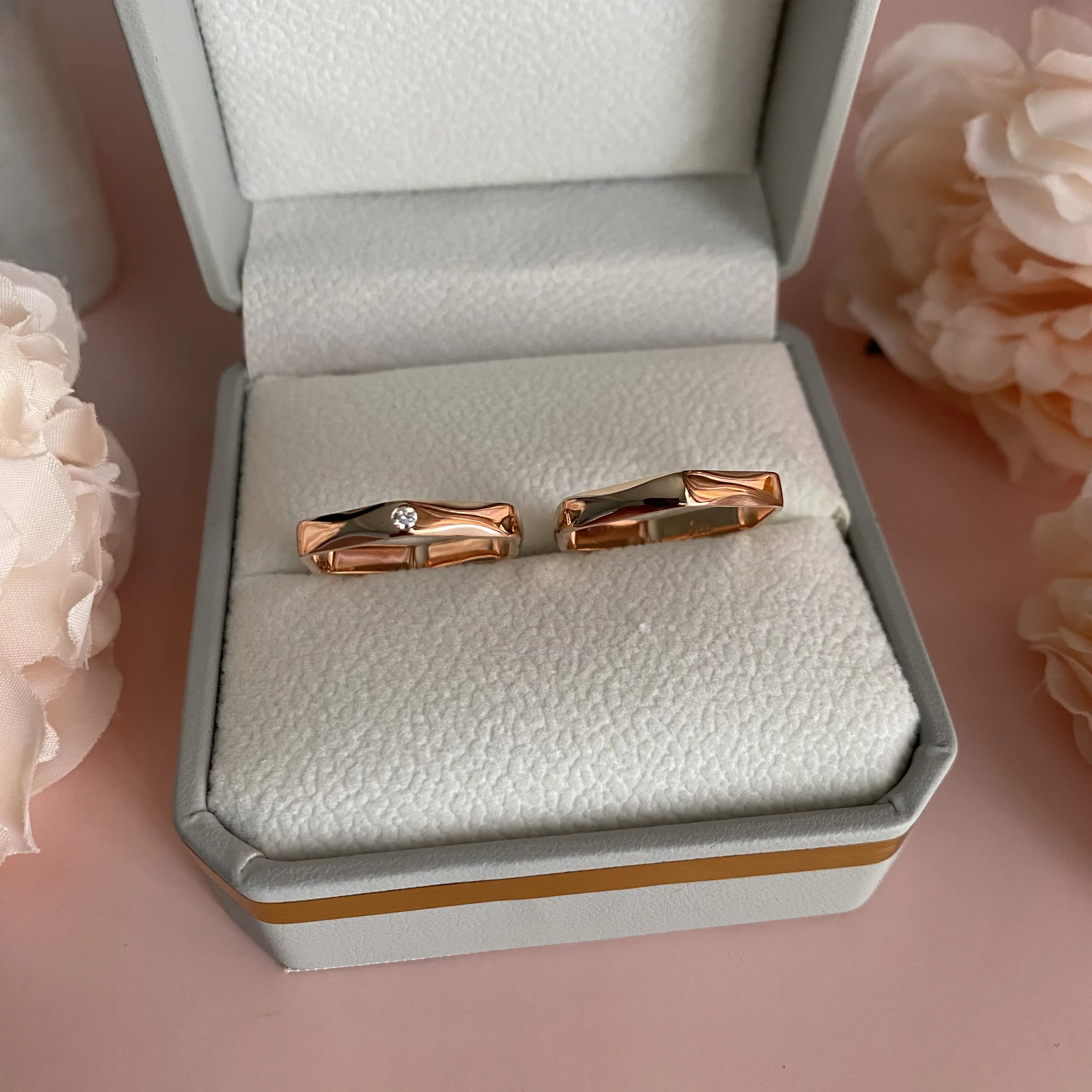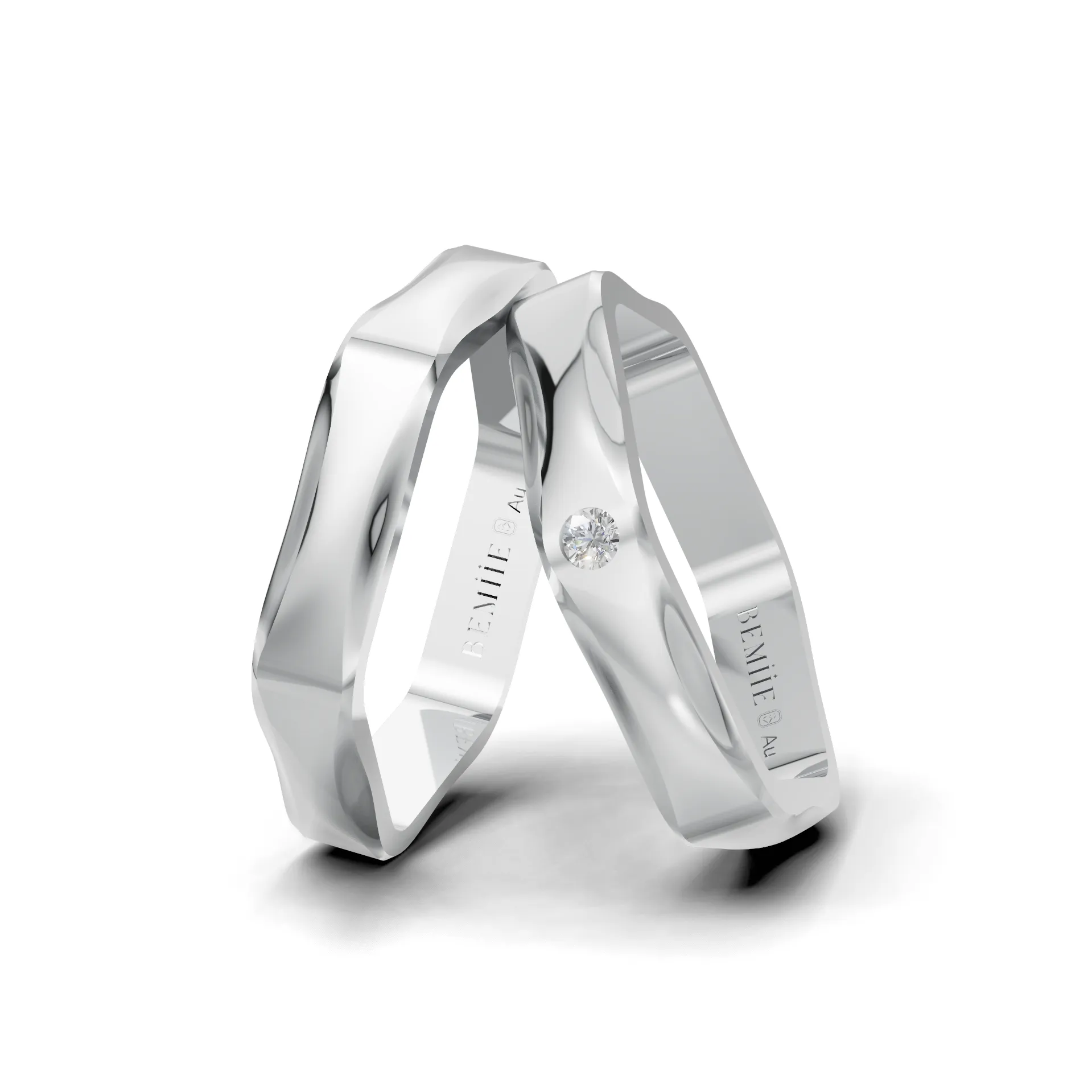 Điểm khác biệt tinh tế nằm ở nhẫn nữ, nơi Bemiie Jewelry khéo léo đính một viên kim cương tự nhiên nhỏ duy nhất. Viên đá được đặt gọn gàng giữa một mặt lục giác, như một vì sao nhỏ tượng trưng cho nét mềm mại, nữ tính và cũng là dấu ấn riêng của cô dâu. Phần đai nhẫn mảnh vừa đủ để giữ được sự thanh thoát, nhưng vẫn đảm bảo độ dày tiêu chuẩn để đeo lâu dài mà không bị biến dạng.