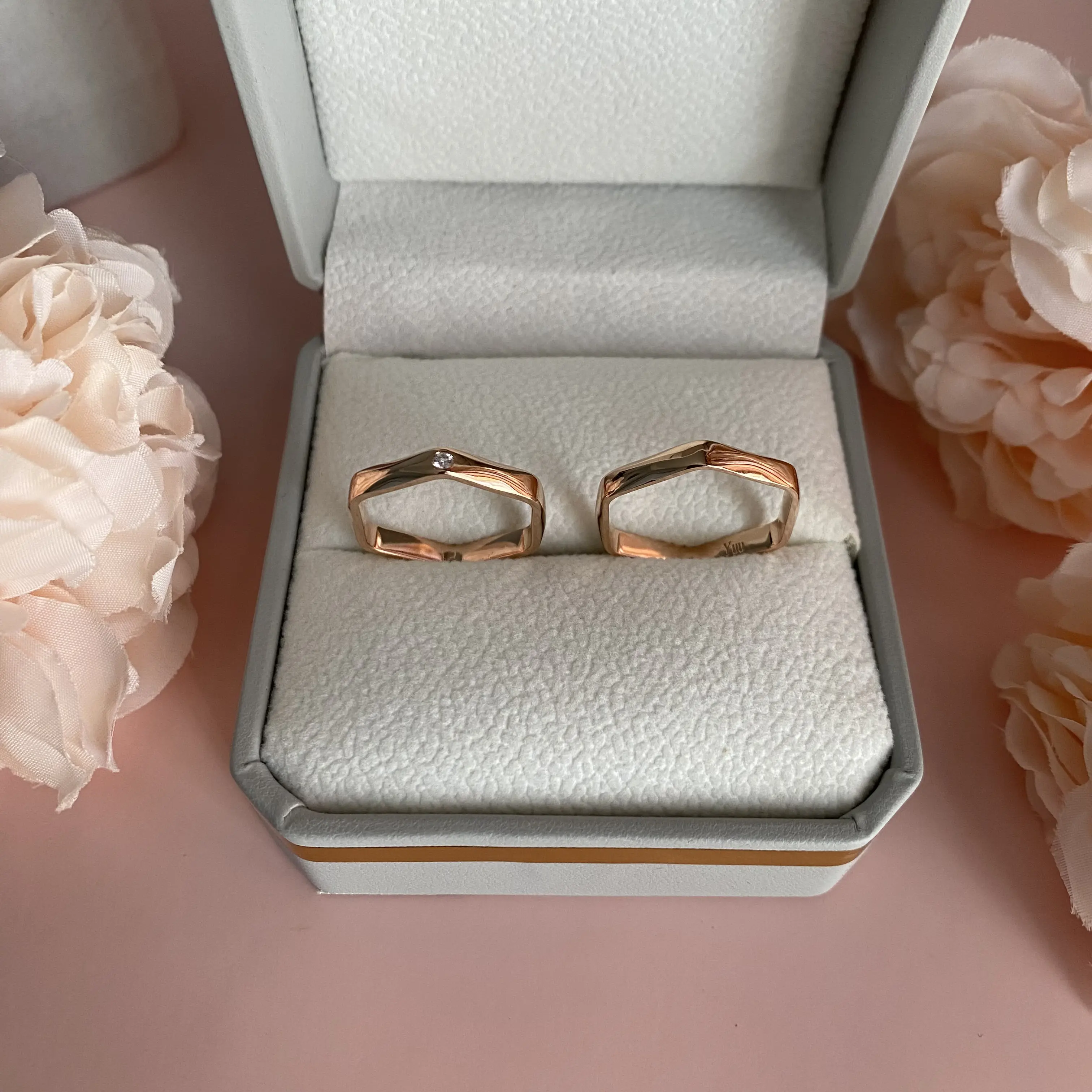 Ở thiết kế này, nhẫn nam và nhẫn nữ được tạo hình giống nhau, cùng mang đường nét lục giác sắc sảo chạy dọc theo toàn bộ đai nhẫn. Bề mặt nhẫn không phải phẳng hoàn toàn mà được xử lý theo dạng mo nhẹ, tạo hiệu ứng ánh sáng phản chiếu sinh động mỗi khi chuyển động. Chính sự đồng điệu giữa hai phiên bản nhẫn nam và nhẫn nữ đã tạo nên một hình ảnh đẹp về sự hòa hợp và gắn kết trong hôn nhân.
