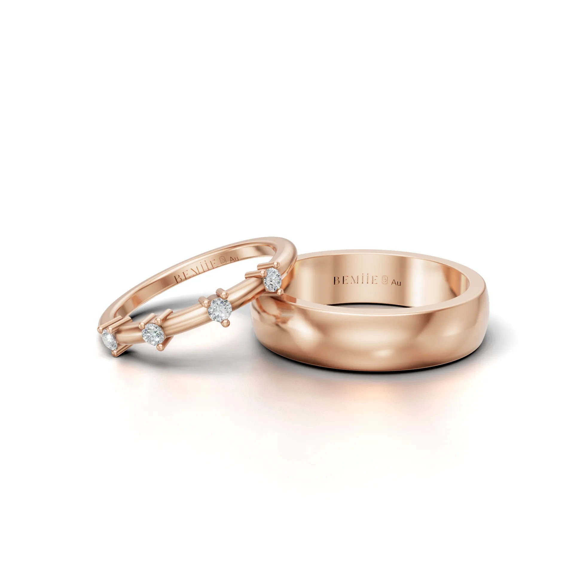 Nhẫn cưới Serene Spark là mẫu nhẫn dành cho những đôi yêu thích phong cách tối giản nhưng vẫn muốn giữ lại nét sang trọng đầy tinh tế. Thiết kế được tạo nên từ sự hài hòa giữa hai phiên bản: chiếc nhẫn nam trơn bản đầy đặn, và chiếc nhẫn nữ thanh mảnh điểm bốn viên kim cương tự nhiên, mỗi viên được giữ bởi ba chấu riêng biệt, tạo nên vẻ đẹp cân đối, nhẹ nhàng mà vẫn vô cùng nổi bật.