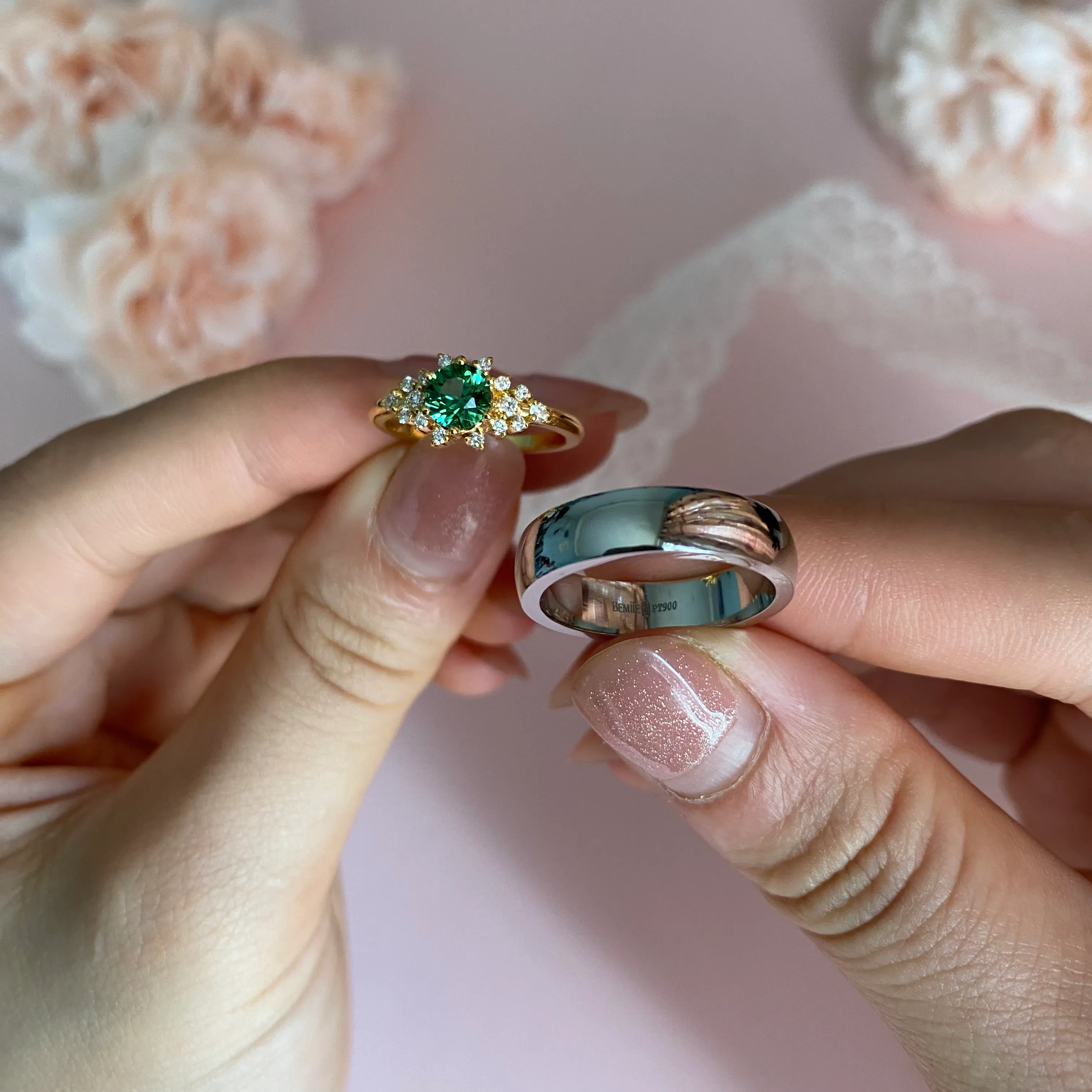Bạn có thể tùy chỉnh độ dày đai nhẫn, kích thước kim cương, kiểu chấu, chất liệu vàng (10K, 14K, 18K, Platinum), hoặc thêm khắc riêng theo ý muốn. Bemiie luôn sẵn sàng điều chỉnh để giúp hai bạn tìm được phiên bản nhẫn cưới hoàn hảo nhất.